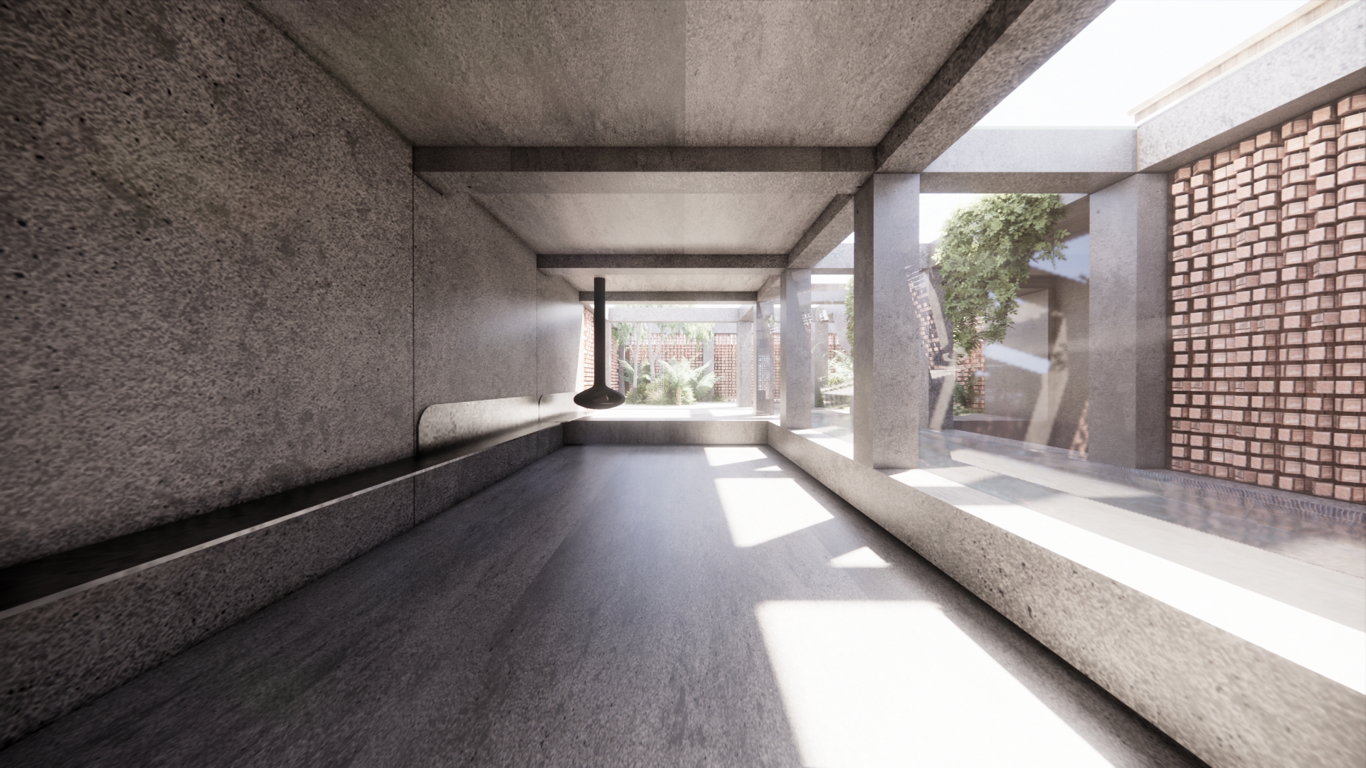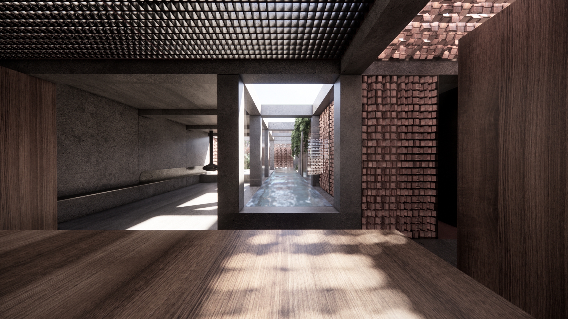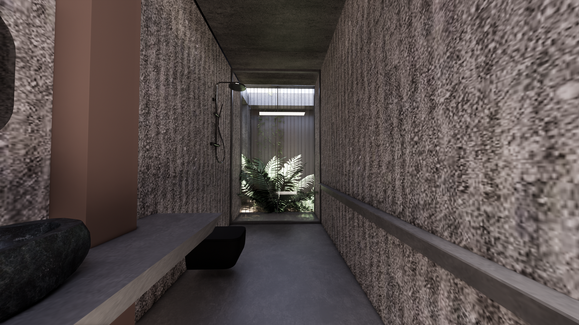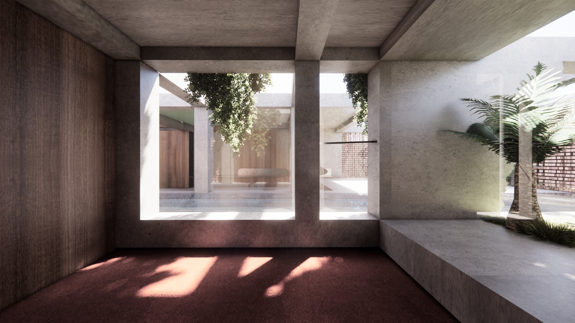 A central pool anchors the plan, acting as both an organising device and a climatic moderator. It draws light deep into the building, tempers the surrounding environment and establishes a calm, reflective centre to the project. Spaces are intentionally pulled inward, creating a sense of intimacy and retreat, with controlled openings that frame light, landscape and sky.