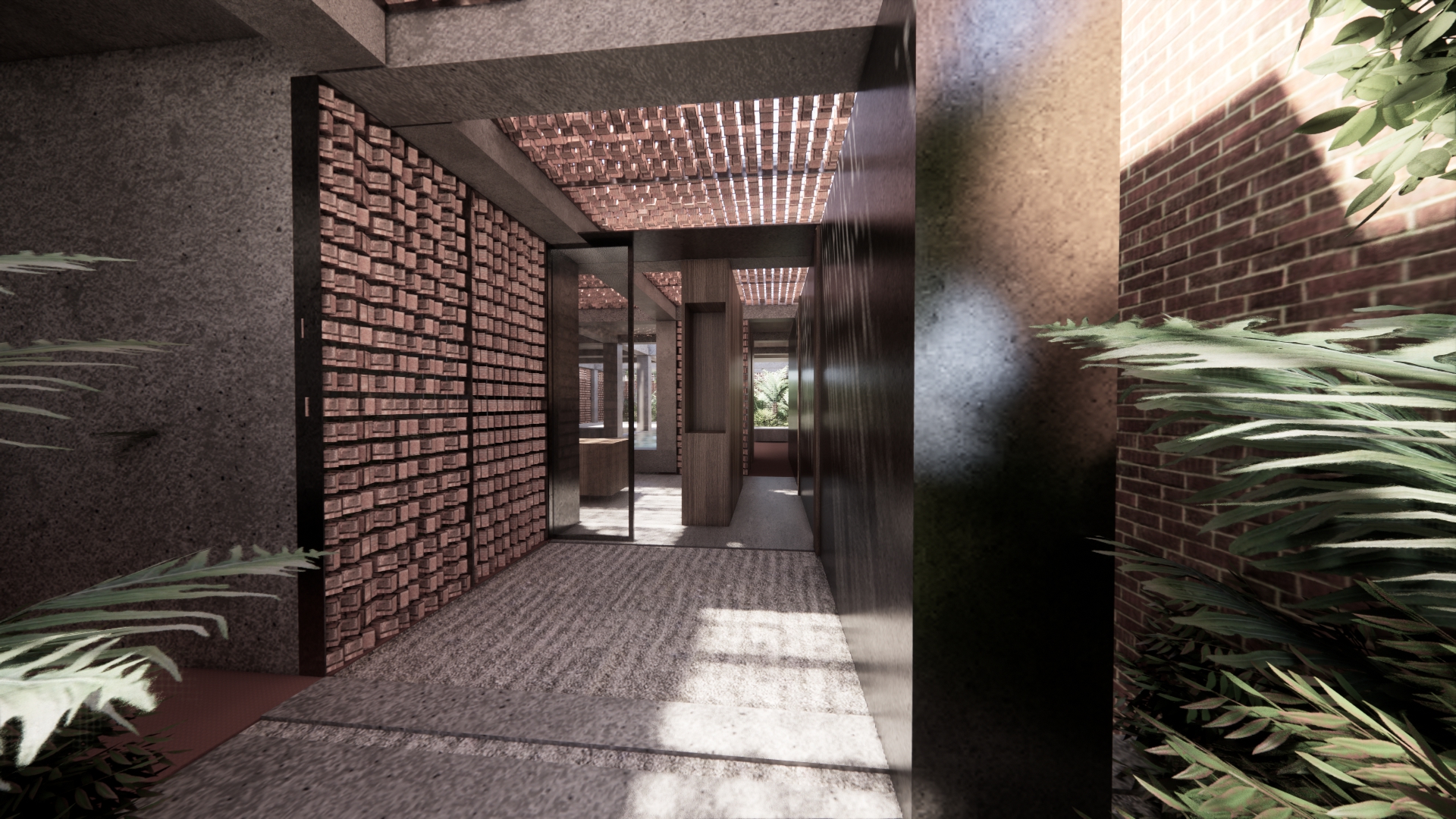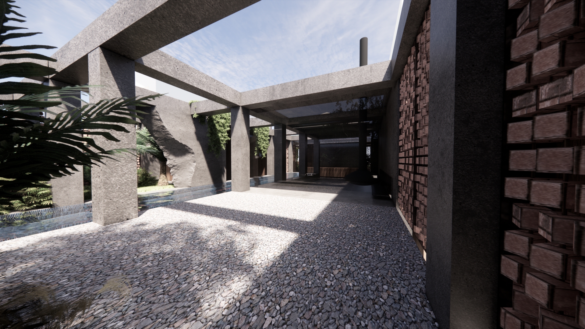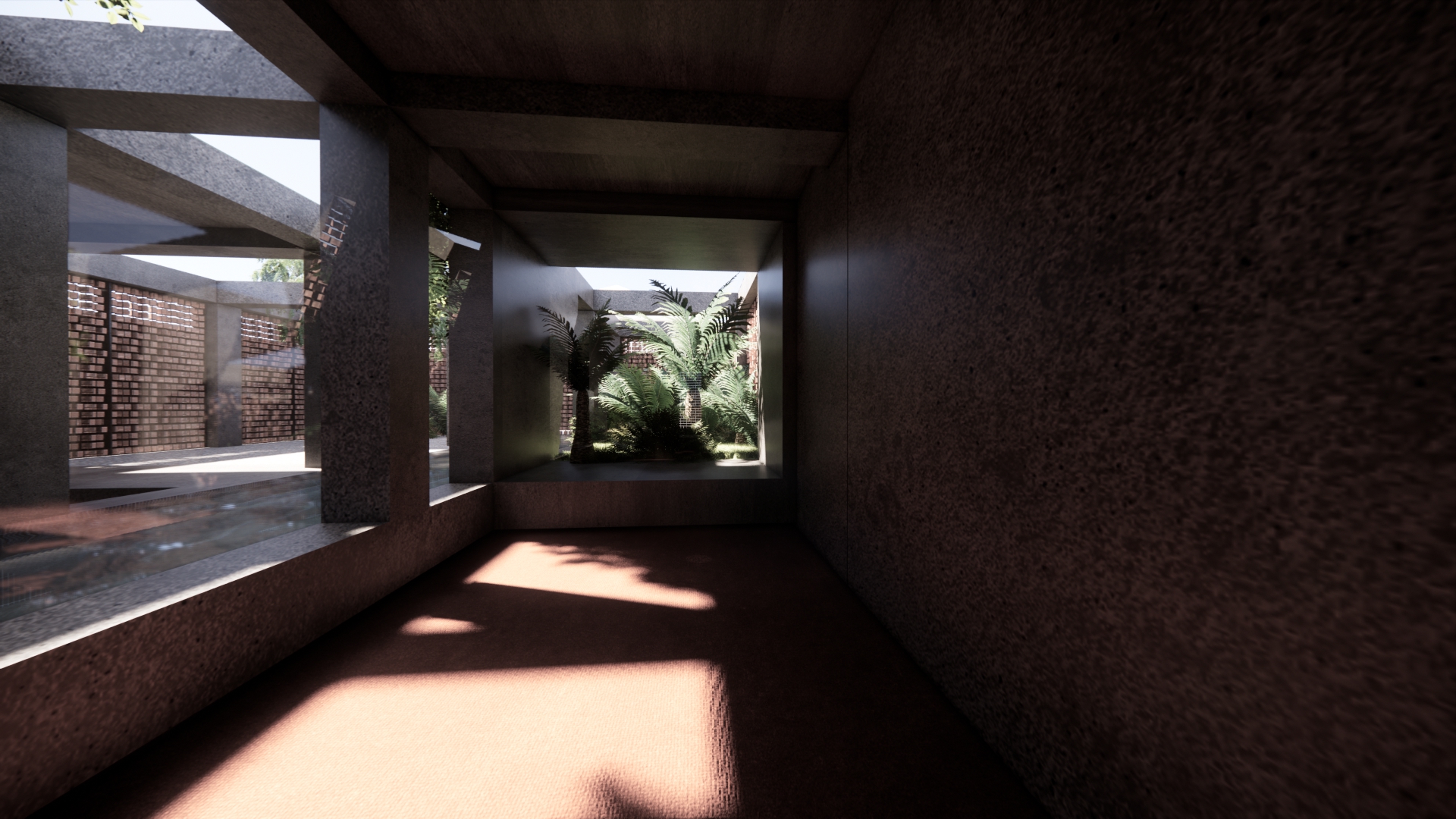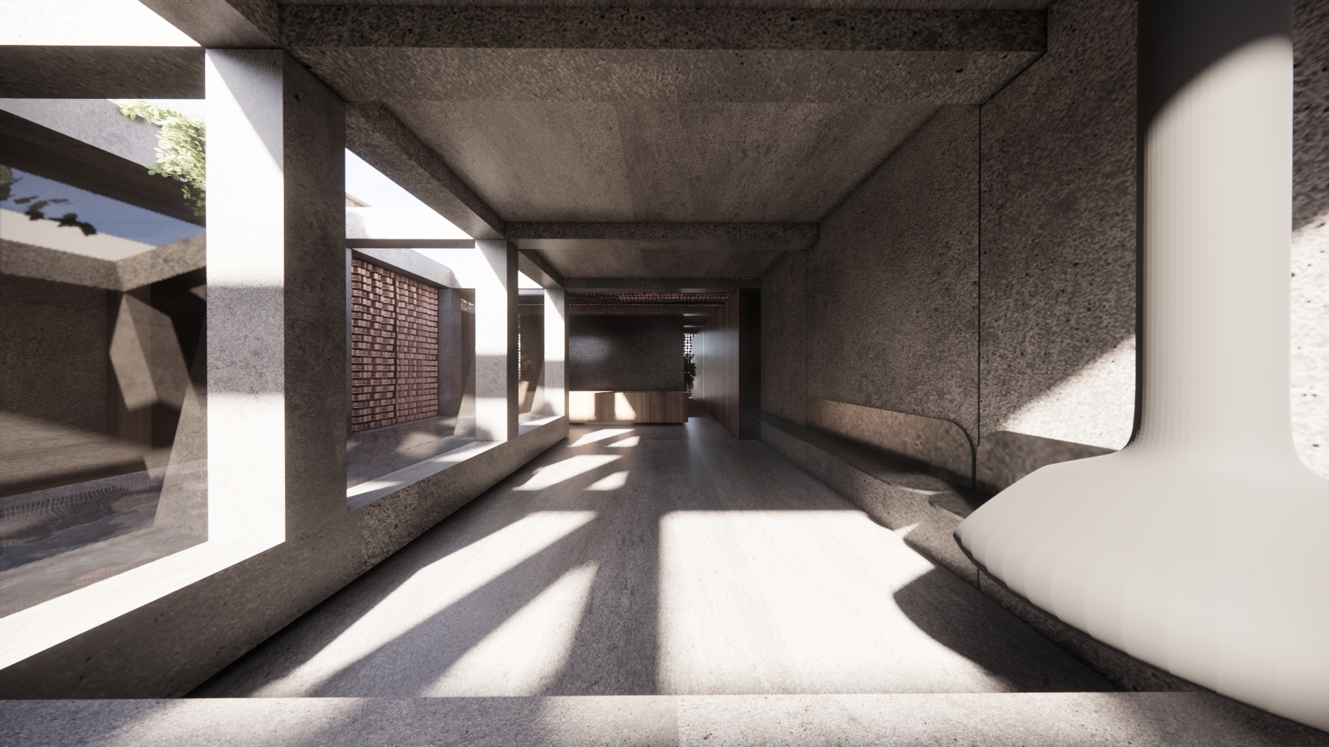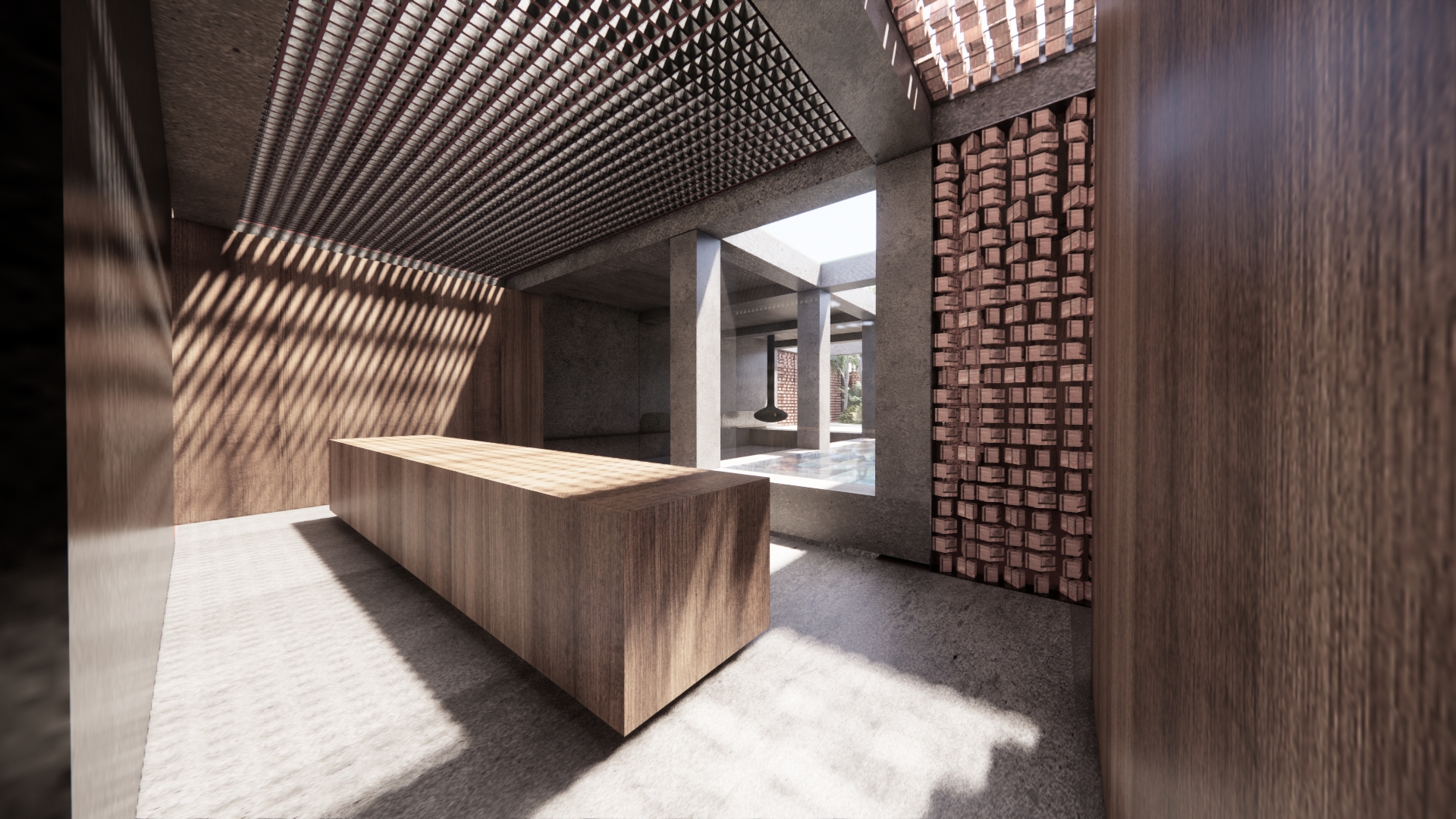 A central pool anchors the plan, acting as both an organising device and a climatic moderator. It draws light deep into the building, tempers the surrounding environment and establishes a calm, reflective centre to the project. Spaces are intentionally pulled inward, creating a sense of intimacy and retreat, with controlled openings that frame light, landscape and sky.