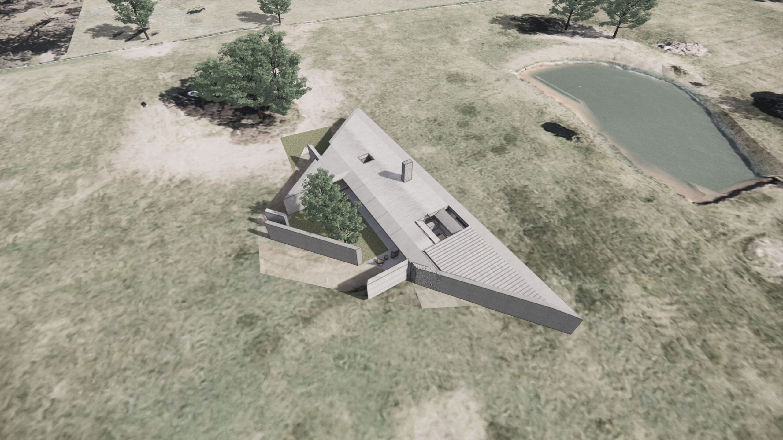 Set within the vast openness of the Australian rural landscape, this house is conceived as a precise incision into the land, where architecture and terrain converge. The building is anchored deeply into its site, reading less as an object placed upon the landscape and more as a landform shaped by it. Like a contemporary act of land art, the house cuts through the terrain, framing expansive northern views across open paddocks while simultaneously carving out a protected southern courtyard.