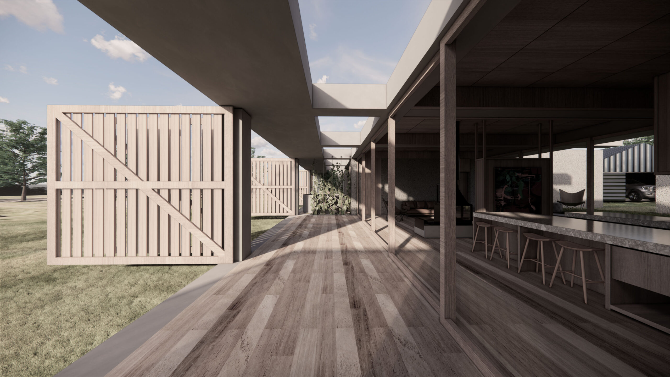 This sheltered courtyard operates as both climatic buffer and place of retreat, tempering harsh north-westerly heat and shielding the home from cold southerly and easterly winds. In this way, the building acts as a refuge within an exposed environment, offering moments of stillness, enclosure, and intimacy against a broader, elemental backdrop.