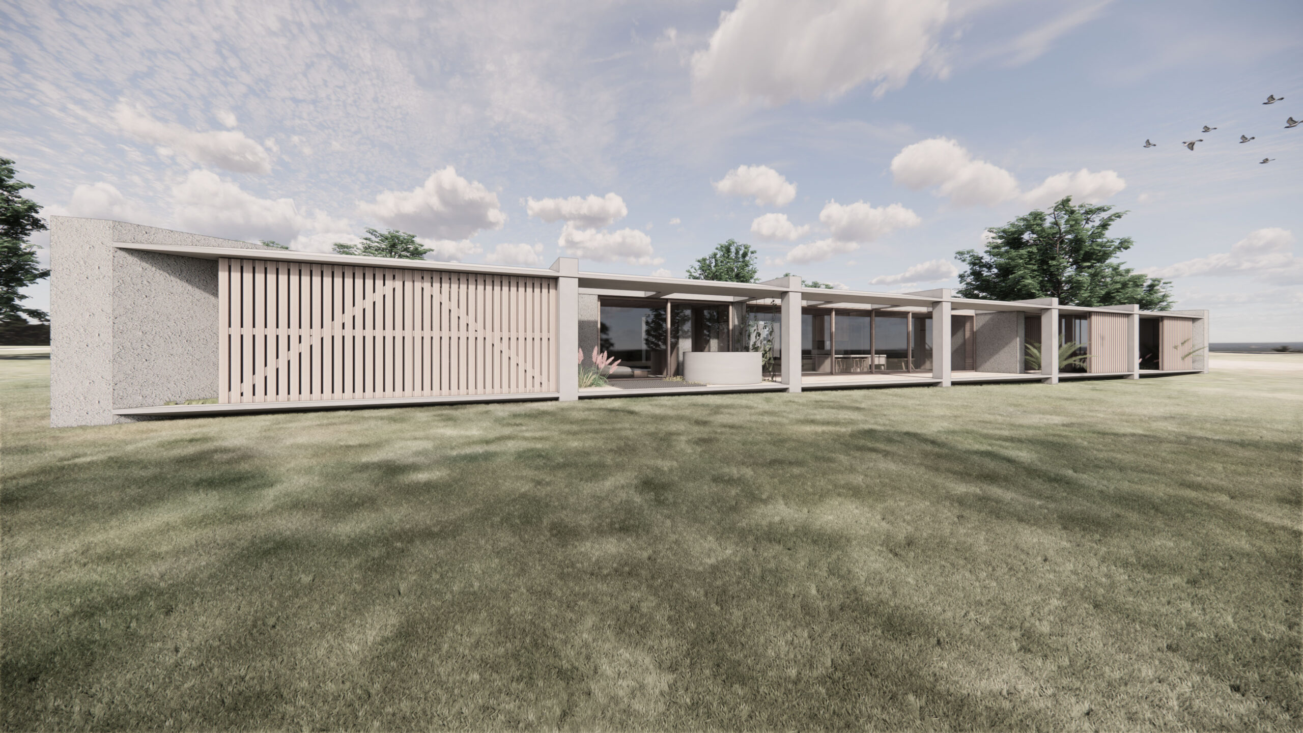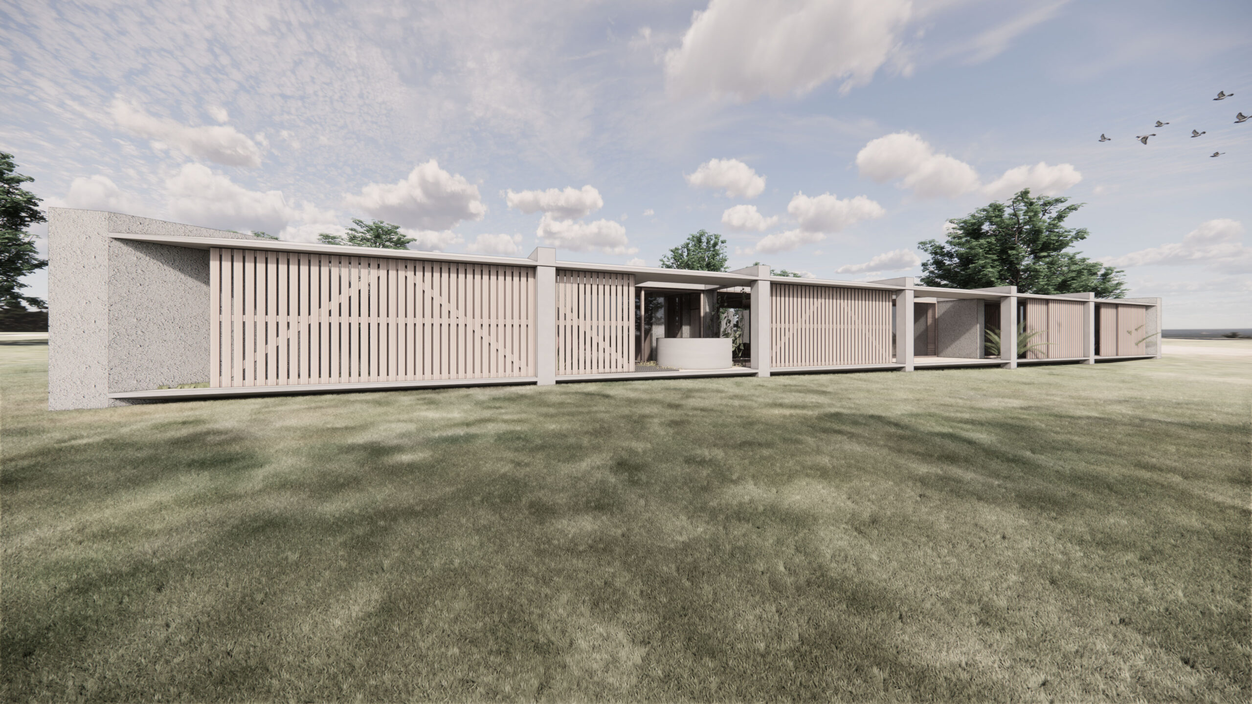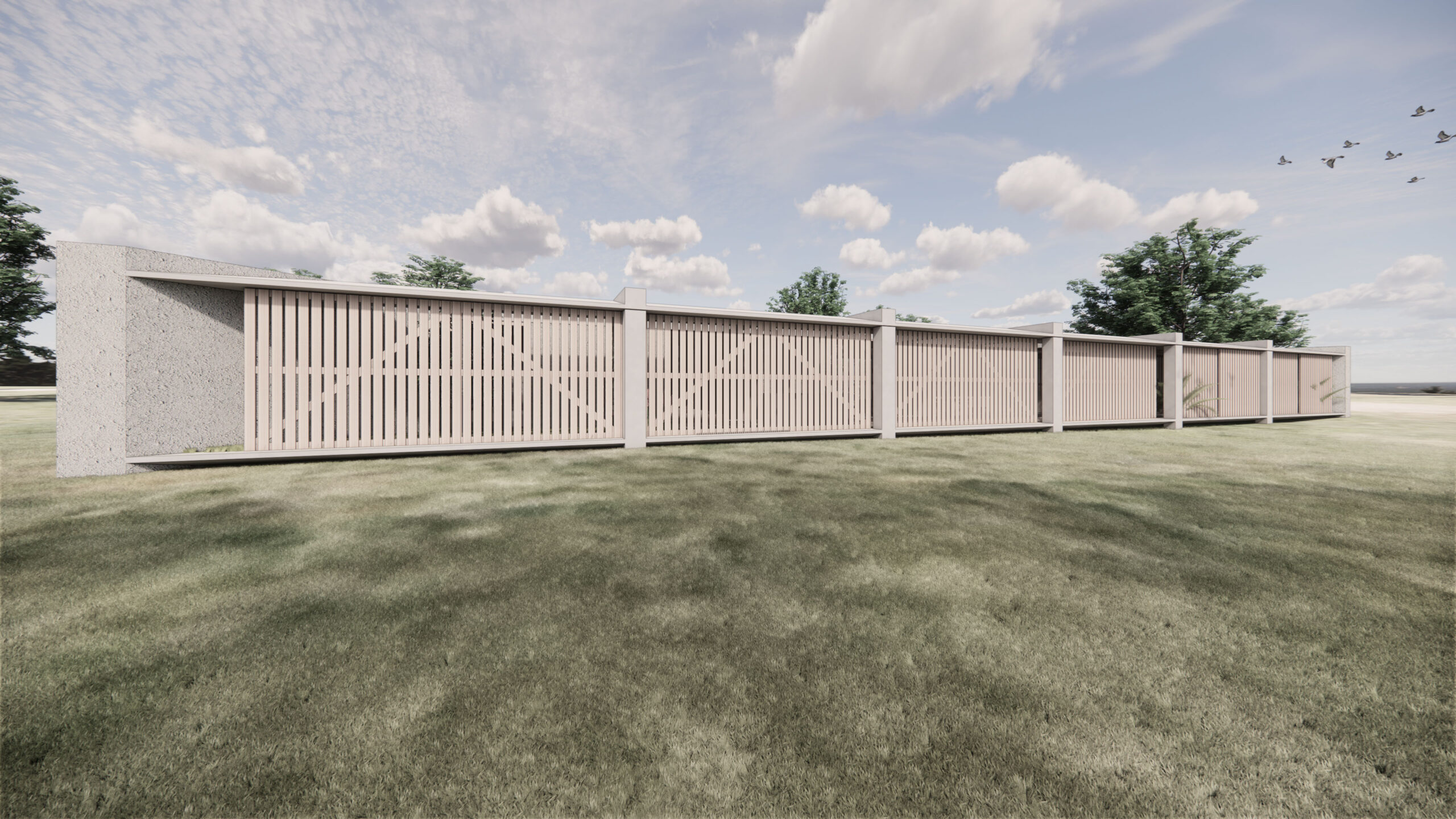 The material palette is deliberately reduced to three primary elements: rammed earth, off-form concrete, and timber. This restraint allows the architecture to be read with clarity, foregrounding mass, proportion, and the slow movement of shadow across surface. Material becomes structure, enclosure, and expression simultaneously, eliminating excess in favour of legibility and permanence.